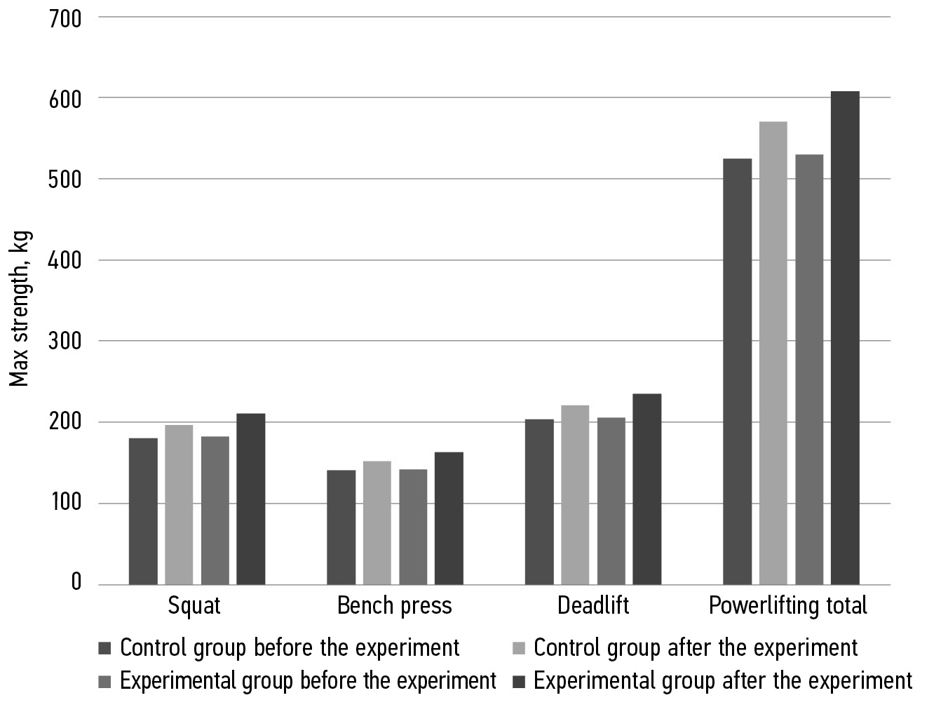 METHODS: The study included trained male powerlifting cadets aged 18–25 with a sports rating of at least 1st category and at least 3 years of experience in powerlifting. It involved a total of 16 participants, who were randomized into the control and experimental groups of 8 participants each. The groups were equalized based by initial indicators of strength training, age, sports rating, and anthropometric data. Both groups underwent an initial test to verify their homogeneity based on key study parameters. All participants underwent a physical examination and signed informed consent to participate in the study. We reviewed relevant sources and guidelines; conducted tests; and employed the methods of pedagogical observation, pedagogical experiment, and correlation analysis.