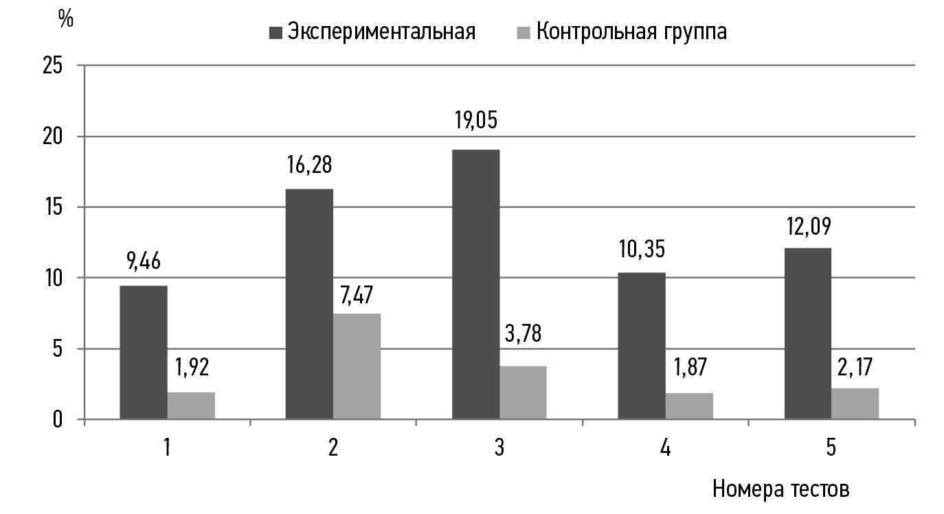 На рис. 1 представлены результаты анализа показателей относительного прироста результатов тестирования общей физической подготовленности пауэрлифтеров 60–65 лет и их сверстников из контрольной группы за два месяца подготовительного периода.