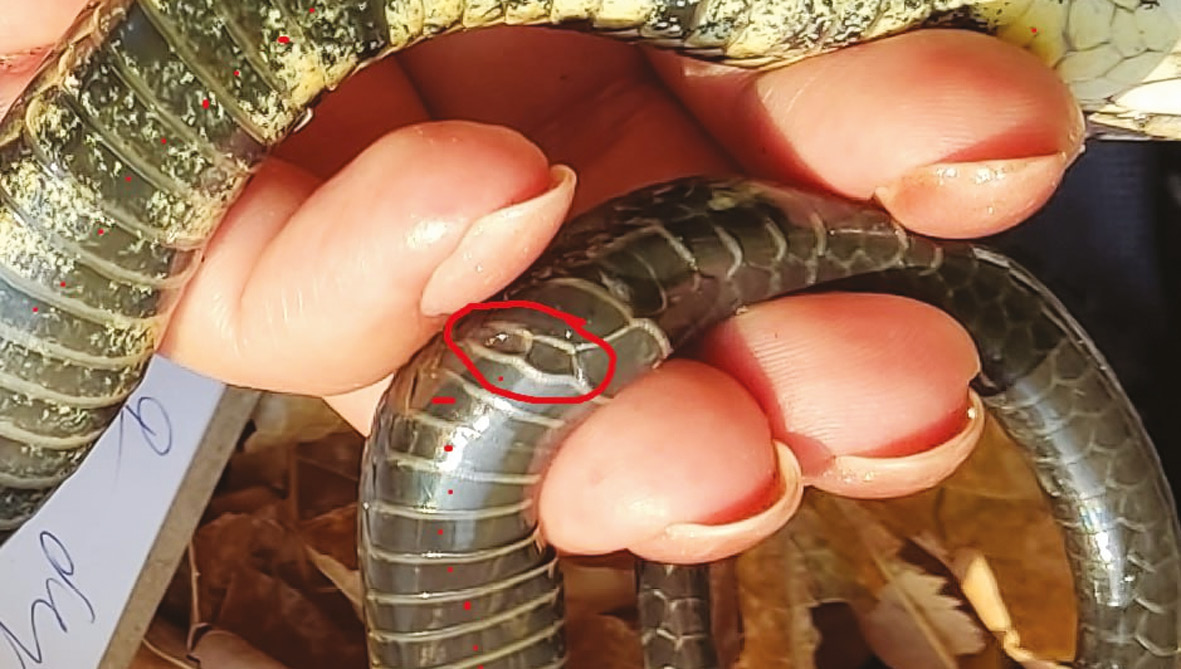 Рис. 1. Аберрация фолидоза брюха у водяного ужа Natrix tessellata
