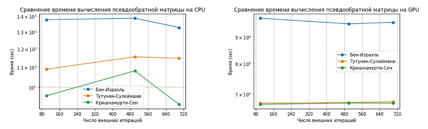 Результаты. На рис. 1 представлены графики сравнения времени вычисления псевдообратной матрицы для методов (1)–(3), примененных к матрице A4096×4096 на CPU и GPU.