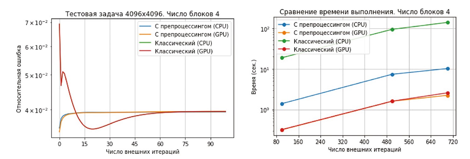 На рис. 2 приведены графики, демонстрирующие сравнение относительной ошибки и времени выполнения классического алгоритма и его версии с препроцессингом для матрицы A4096×4096.