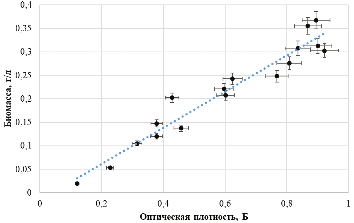 Для учета биомассы использовали гравиметрический метод и оценку по мутности клеточной суспензии с использованием спектрофотометра. Для большей точности методы объединили и построили градуировку по биомассе. Определяли оптическую плотность разведений клеточной суспензии и концентрацию биомассы, полученную весовым методом, а затем по этим значениям строили градуировочный график. Для построения графика использовали диапазон с оптической плотностью от 0,1 до 1, так как для этого диапазона сохраняется линейность закона Бугера–Ламберта–Бера [3]. Полученные результаты представлены на рис. 1.