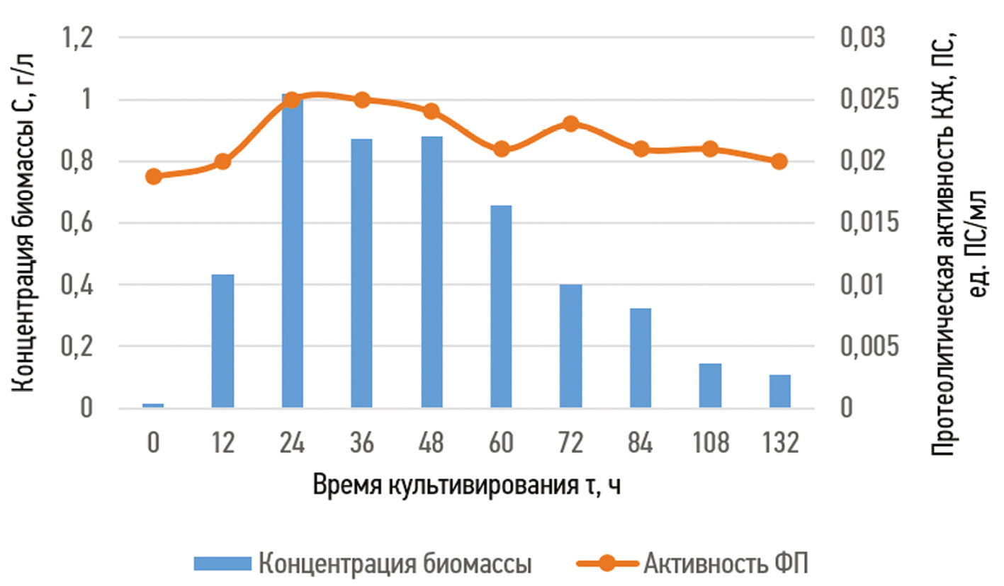 Рис. 2. Зависимость концентрации биомассы клеток бактерий и протеолитической активности культуральной жидкости от времени культивирования