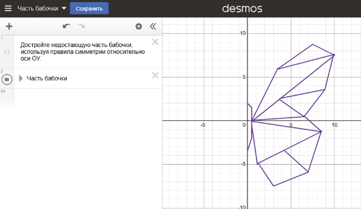- «Осевая и центральная симметрии». Задания основаны на том, что дан фрагмент изображения, выполненный в интерактивной среде Desmos (рис. 1). Обучающимся необходимо достроить рисунок до целого, применяя понятие осевой симметрии. Данная тема рассматривается в рамках нескольких разделов математики, на разных ступенях (5–6-е, 7–9-е классы), с возрастанием строгости изучения понятия (от описательного до формального определения). Также при разработке подобных задач возможно обучающимся предложить добавить параметр в координаты точек или аналитическую запись функции, что позволит сделать изображение динамичным. Такой подход обеспечит пропедевтику понятия параметр.