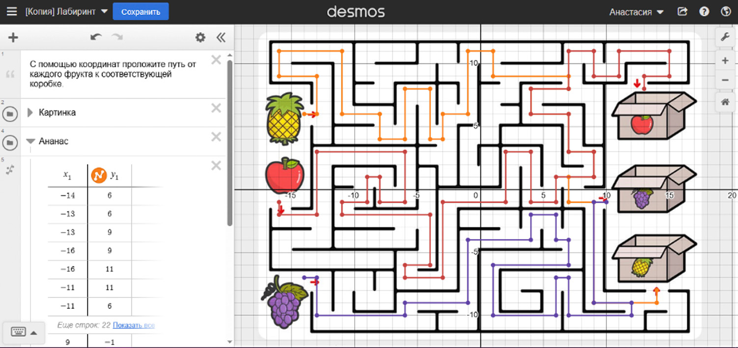 - «Координатная плоскость. Координаты точек». Первый тип заданий основан на построении различных фигур и объектов, примеры которых предложит учитель. Сложность данных заданий определяется тем, из какого количества координат состоит фигура, какое количество объектов в целом необходимо разместить на координатной плоскости и необходимо ли введение параметра. И второй тип задач раздела «Координатная плоскость» основан на том, чтобы определять координаты точек и строить ломаные на координатной плоскости. На рис. 3 представлено задание «Лабиринт».