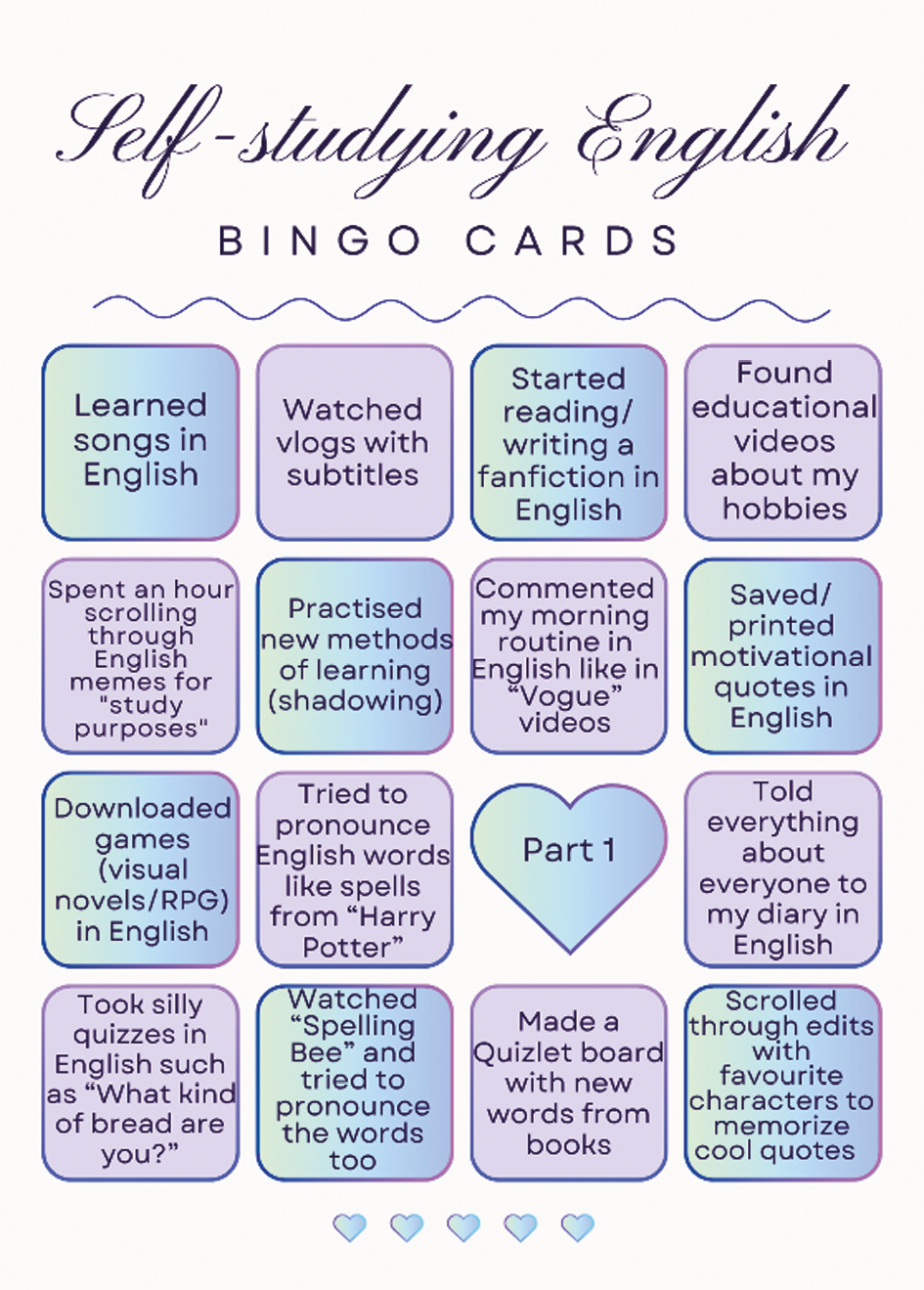 Created bingo cards “Self-studying English” (Figure 1) can help to build an enjoyable, low-pressure environment, breaking the monotony of traditional study routines and sparking creativity in the learning process. These bingo cards provide an opportunity for learners to learn English in a playful and motivating way. Besides, the bingo cards also make it easier for learners to discover new ways to practise the language, such as using language apps, watching English movies, or reading books in English while having fun and staying motivated. These activities are designed to be engaging and varied, making self-study feel less as a chore and more as a series of exciting challenges.