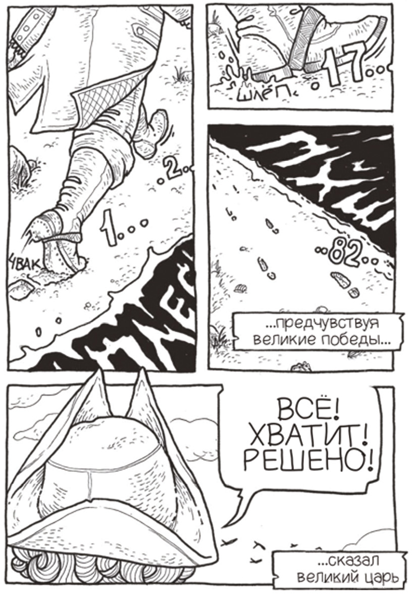 Слова «ЧВАК» и «ШЛЕП» передают хлюпанье грязи; «ПХШ» — шум воды, усиливая ощущение стихии. Шрифт подчеркивает эти эффекты: неровные контуры для грязи, волнистый — для воды. Сноска «…ПРЕДЧУВСТВУЯ…» и реплика «ВСЁ! ХВАТИТ!» отражают решимость Петра и его контроль над хаосом, подчеркнутый контрастом шрифта.