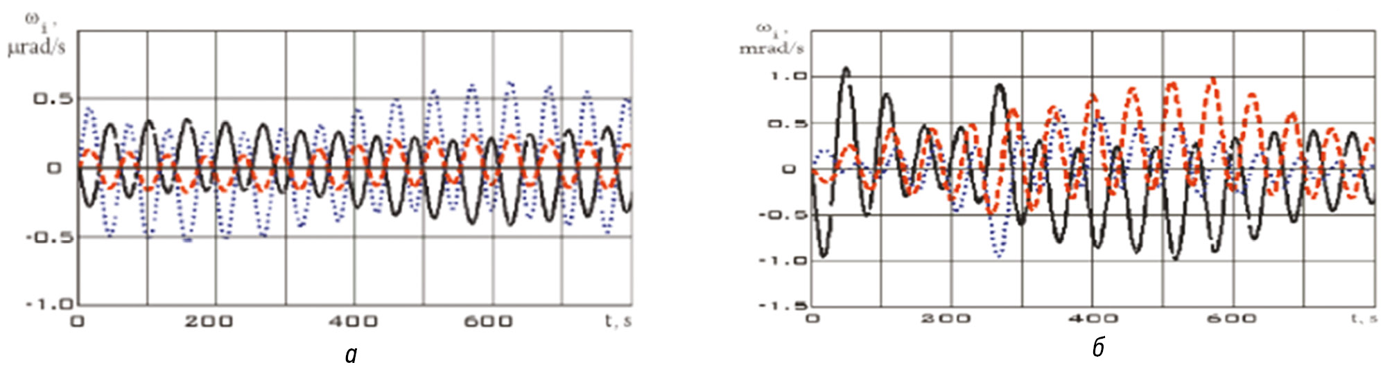 Рис. 1. Зависимости компонентов вектора угловой скорости в системе координат магнитометра: а — в режиме стабилизации; б — в режиме переориентации; ωx (черный); ωy (голубой); ωz (красный)
