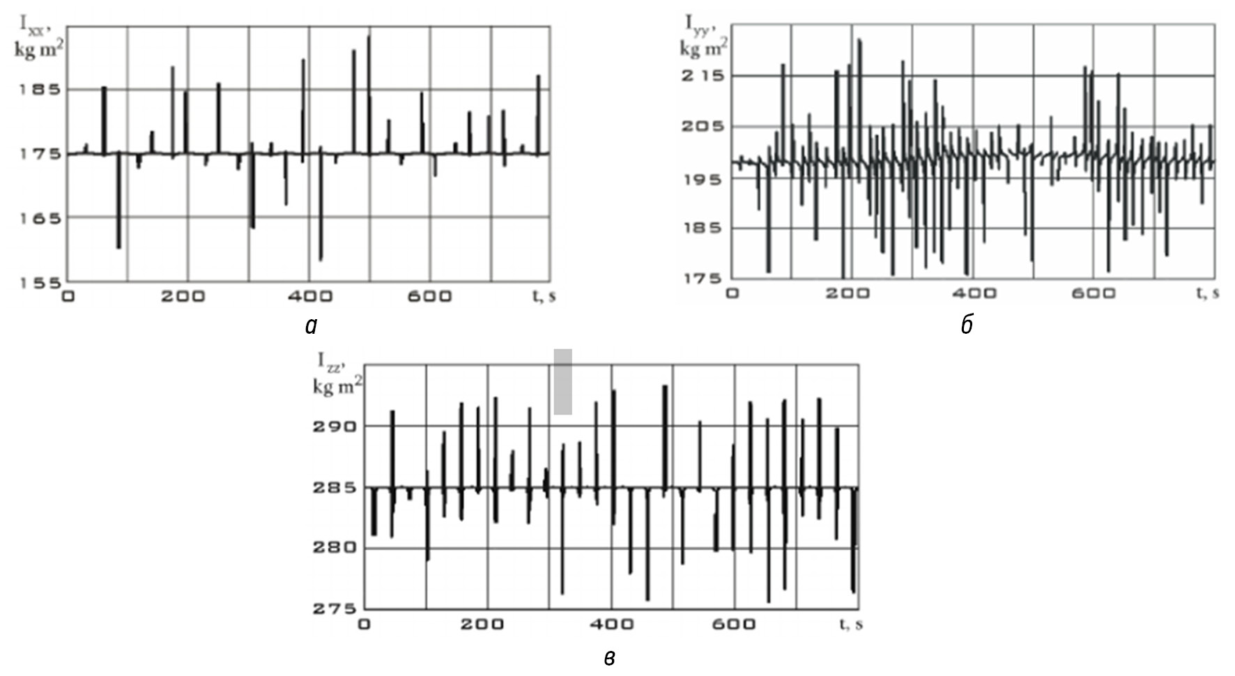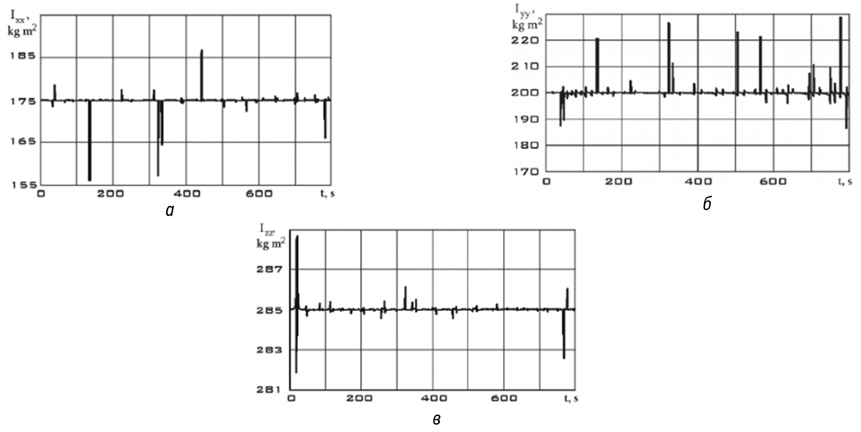 Рис. 2. Зависимости диагональных компонентов тензора в системе координат магнитометра в режиме стабилизации: а — Ixx; б — Iyy; в — Izz