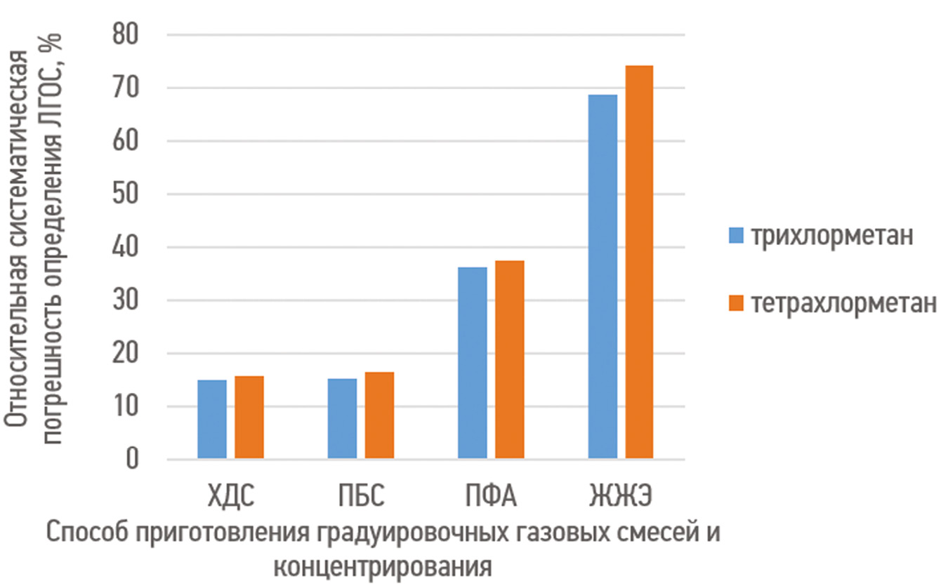 Рис. 3. Оценка точности количественного определения трихлорметана и тетрахлорметана с использованием стандартных методик и ХДС